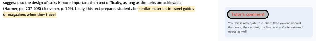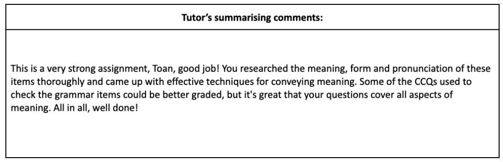 Research trong CELTA chỉ mang nghĩa đơn giản là đi tìm nguồn thông tin để bổ sung cho những gì mình viết trong WA – dễ hơn nhiều so với research kiểu làm luận án. Mình thấy chỉ cần bỏ ra nhiều thời gian đọc và thu thập nguồn một cách ngăn nắp để dùng trong bài WA, thì bài của mình sẽ tự dưng đầy đủ và chi tiết. Nhưng chính vì bỏ nhiều thời gian nên nhiều lúc mình bị tình trạng analysis paralysis vì tìm được nhiều nguồn quá mà chả biết sử dụng nguồn nào vừa hợp lý mà vừa đầy đủ. Với lại, bài WA nào cũng giới hạn số từ nên mình lại càng phải chọn kỹ. Lúc này mình mới tự nhắc mình rằng đây chỉ là khoá đào tạo tân giáo viên nên tutor sẽ không kỳ vọng mình phân tích một cách hoàn hảo. Mình chỉ cần chọn lọc những gì mình thấy quan trọng nhất, hoàn thành bài và nộp bài, còn lại để tutor lo :D. Bạn có thể thấy nhận xét dưới đây của tutor cho bài WA đầu tiên của mình phản ánh nhận định đó.