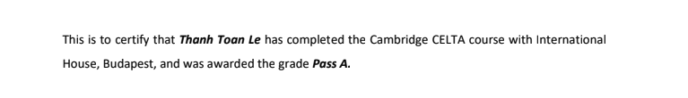 Tháng vừa rồi mình học CELTA ở International House Budapest và may mắn đạt điểm cao nhất là Pass A (top 5.6% worldwide). Mình muốn chia sẻ cách mà mình đạt được điểm số này.