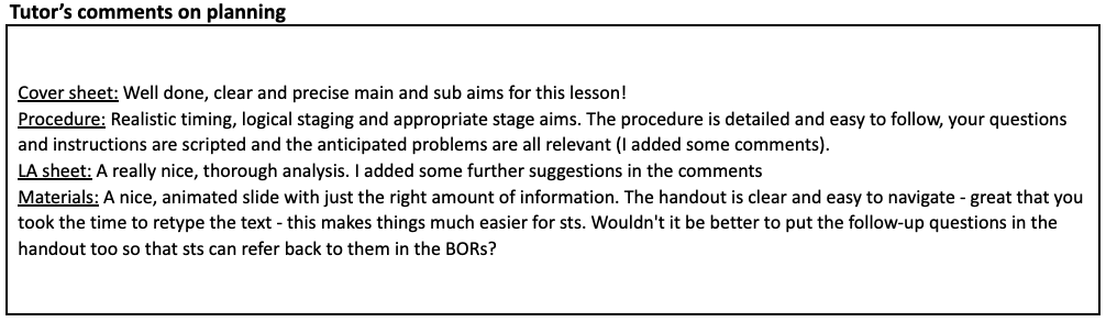 - Detailed LPs: Làm sao để biết LP có đủ chi tiết hay chưa? Tutor của mình chia sẻ rằng một LP chi tiết là một LP mà bất kỳ một giáo viên nào nhìn vào cũng có thể hiểu và dùng LP đó để dạy được y như người viết mong muốn. Các bạn có thể nghía qua LP của mình cho một bài Reading ở đây.