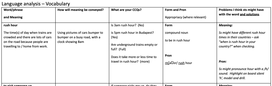 Với các bài yêu cầu dạy một số các TL như từ mới hoặc cấu trúc ngữ pháp mới, mình sẽ được yêu cầu phân tích những TL đó trước. Việc phân tích hết tất cả các thành phần của một TL là rất quan trọng, vì nó chứng tỏ rằng mình hiểu sâu về TL đó và vì thế có thể truyền tải được hiệu quả nhất các khía cạnh chính của TL đó tới người học. Sau đây là một ví dụ về cách phân tích cụm từ “rush hour” (courtesy of International House Budapest)